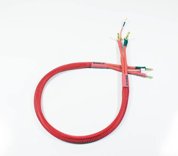 These Assault RC Power Leads are top of the line highly conductive charging leads made to charge your performance batteries at high or low amps. These Power Leads are covered in a sheen red protective nylon wrap end capped with heavy duty Assault RC screen printed Shrink tube holding the leads together. The Charger end comes with a 2s balance connector and 2 straight 4mm HVC gold plated bullet plugs. The Battery end is outfitted with a 2mm balance bullet and 2 HVC gold plated 4/5mm stepped bullet plugs to fit ALL 4 and 5mm inboard bullet batteries. These leads can be used on both 7.4v and 7.6v LiPo and Silicone Graphene Battery types. Great for use on all modern chargers.