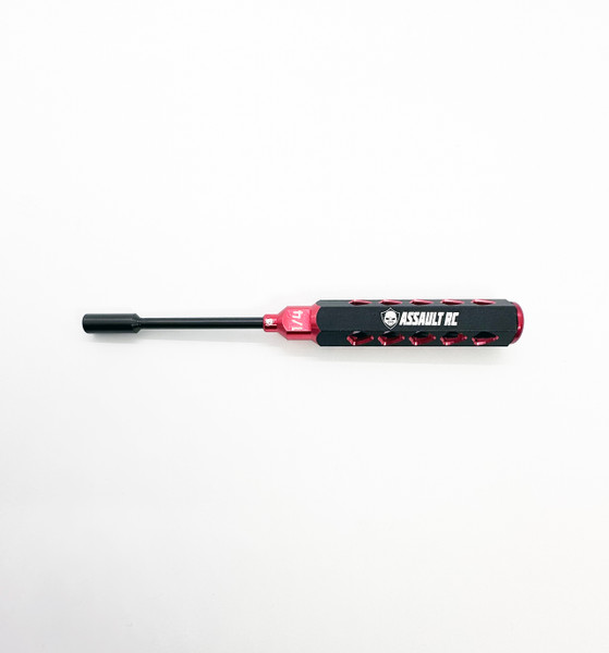 The must have set of tools for your RC collection. This is the 1/4" Tactical Nut Driver ready to perform at the highest level of wrenching under pressure and the hardest working condition. This lightweight dual color handle is made from aircraft aluminum milled with precision with the love of Assault RC all through out. From the shield shaped lightning cutouts to the multiple laser etched locations for easy use it is by far the nicest feeling and looking tool in your tool box or on your pit table. Pair those looks with the super durable hardened tips you are sure to fall in love with these tools. The tips are replaceable incase your use those Popeye pumped up forearms and bust one. Buy what you need or complete the entire set.  We suggest etching your name on the priceless pieces of art to ensure you have them for the next time you reach for one.