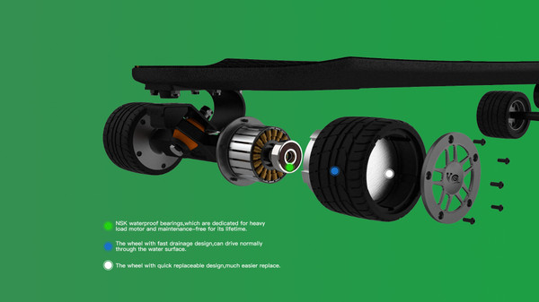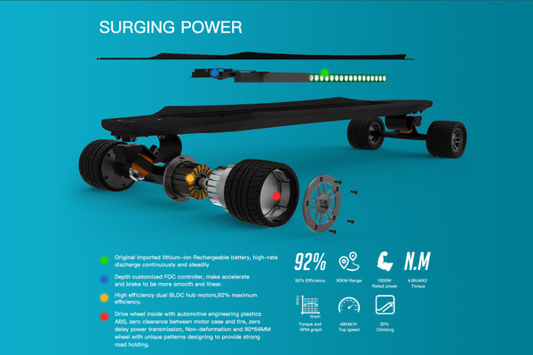 This skateboard offers precise driving with little vibration and noise. Professionally damping system with tension suspension and 50A rubber tires filtering. Stable structure shaped PU make sure the contact area when turning is constant and linear, steering feedback is accurate. A alloy steel shaft with .001 mm tolerance, heat treated, abrasion resistant corrosion stability. NSK waterproof bearing, which are dedicated for heavy load motors and maintenance free for a lifetime of use. Quick wheel replacement design and fast drainage for water which is IP55 rated. UL approved charges that charge within 1.3 hours and can handle loads up to 507lb.