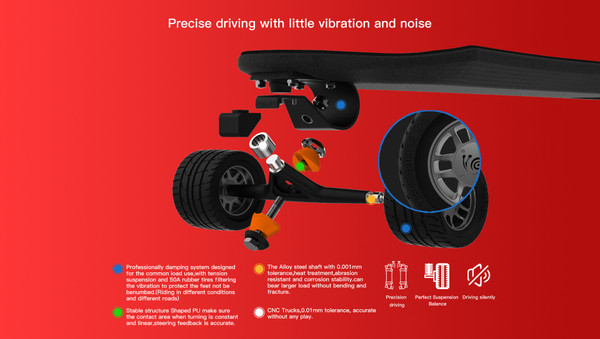 5. Professionally damping system designed for the common load use, with tension suspension and 50A rubber tires filtering the vibration to protect the feet not be benumbed. (Riding in different conditions and different roads)