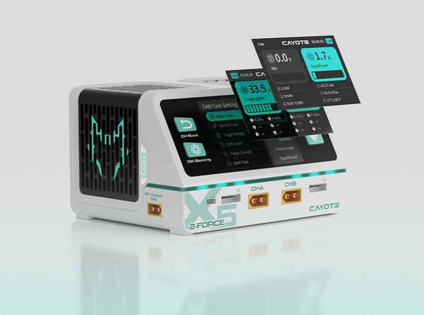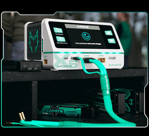 The Cayote 2-Force X5 Racing Dual Battery Charger is a professional-grade dual-channel smart charger built for RC racers who demand speed, efficiency, and reliability. Engineered with high-performance power management, advanced safety protections, and versatile compatibility, this charger is designed to handle everything from pre-race battery activation to on-site multi-task charging.