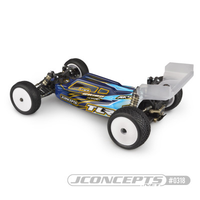 The JConcepts TLR 22 4.0 "F2" Buggy Body is a drop fit for the popular TLR 22 4.0 buggy. With the evolution of race tracks, complicated circuits combining more aggressive jumps and extremely high-speed corners, JConcepts incorporated many features which provide several benefits in the most critical situations. Increased windshield angle provides a steady force upfront during mid-flight wind gusts on large jumps. Forward cab placement changes performance / visible bias which help steering rotation in low traction corners.