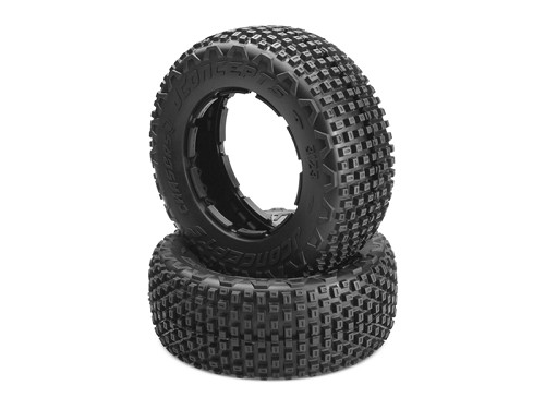 The 1/5th Chasers rely on hefty, medium lugs which are angular in multiple directions. The horizontal type tread has a striking similarity to the trusty 1/8th buggy Crossbow tire which has remained a favorite for many years. Chasers have a squatty, close lug arrangement which gives incredible responsiveness and bites in all conditions. The wet and dry condition tire has small recessed cuts in the top of the tread for extra edges and increased formability over terrain. The center overlapping bar treatment increases durability in the highest wear region of the tire.