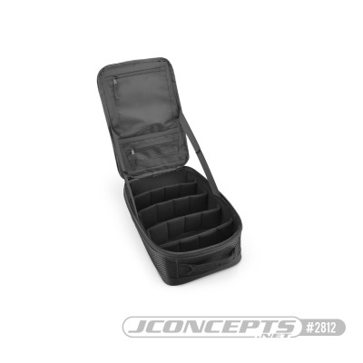 The JConcepts Finish Line Quick Access Nitro Pit Bag, is a great way to organize your area and have all your fuel accessories in one area. This bag is made from a woven high strength fabric fitted with a durable metal handle that boasts a stiff foam covering. Using this bag allows for two different location where fuel bottles can be cinched into position. JConcepts went the extra step and added a business card holder on the outside of the bag allows you to mark this bag as your own. Package includes one pit bag.