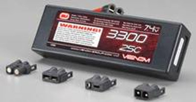 This is the Venom Power 2S 25C 3300mAh 7.4V LiPo Battery with the Venom Universal Plug System. FEATURES: For car usage Venom Universal Four Plug System allows connectivity between today's four most common battery plugs, Tamiya, Traxxas, Deans and EC3, simply attach desired plug to Venom plug on battery's wire leads Balance connector This battery is warranted against defects in original material and workmanship only. No term warranty is offered with this battery