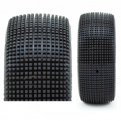 This is a pair of CLAYMORE V2 tire with insert from PROCIRCUIT. Like its predecessor, it's a tire very demanded by our official team drivers. This tire is an evolution or combination of the Square Impact and the Hot Dice. These two treads are the most used on competition events by our team drivers, so we decided to combine them and bridge the gap between them with the same Square Impact's pins pattern but larger pins similar to the Hot Dices.