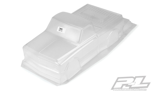 This is a 1972 Chevy® C-10™ Drag Truck Clear Body. Pro-Line is proud to introduce the iconic 1972 Chevy® C-10™ truck body specifically designed for the growing No-Prep SC Drag Racing scene! Bowtie fans will love this ultra-scale body that captures all the signature details of this classic truck and will look and perform great going down the drag strip. Move over muscle cars, the drag truck is in town!