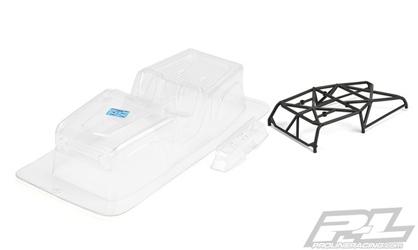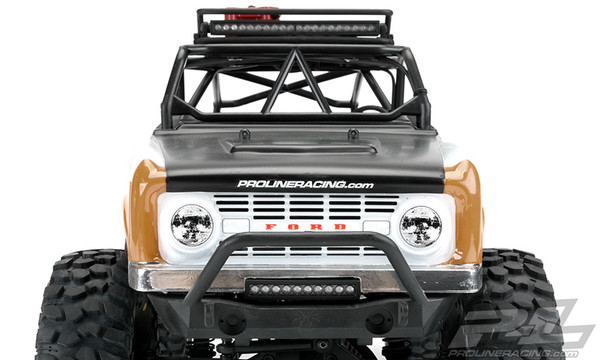 This is a 1966 Ford® Bronco Clear Body with Ridge-Line Trail Cage for Deadbolt. Deadbolt fans prepare to cheer! Pro-Line finally has a body for the Deadbolt chassis that includes Pro-Line's Ridge-Line Trail Cage: the fully licensed 1966 Ford® Bronco body! The most distinguishing feature of Pro-Line's new 1966 Ford® Bronco body is the extremely deep interior allowing you to have full length driver figures for extreme scale realism. The separate dash piece adds another layer of detail not found in most bodies and is designed to work with the stock Deadbolt plastic steering wheels found in the spare parts bag. The Iconic look of the 1966 Ford® Bronco has been captured in every way and will completely transform your Deadbolt into a rugged off-road trail ready machine. The Ridge-Line Trail Cage features a unique scale welded tube frame look that will separate your truck from the crowd. Molded into the cage are mounting locations to fit Pro-Line's Overland Scale Roof Rack directly onto the roof as an option, which opens up the opportunity to mount Pro-Line's 4” LED Light Bar Kit for a fully integrated factory look! The Cage comes with all the hardware necessary for assembly and mounting. Beat your friends to the punch get your 1966 Ford® Bronco body with Cage today!