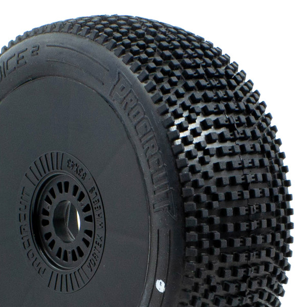 This is the HOT DICE V2 tire from PROCIRCUIT. Like its predecessor, this tire features a medium size dice cube lugs with perfectly balanced tread spacing for maximum forward traction. The two outer rows of lugs deliver a fast corner speed, a very stable an easy to drive feeling and predictable side bite. With the modification of the centre pins it provides higher traction with better durability.