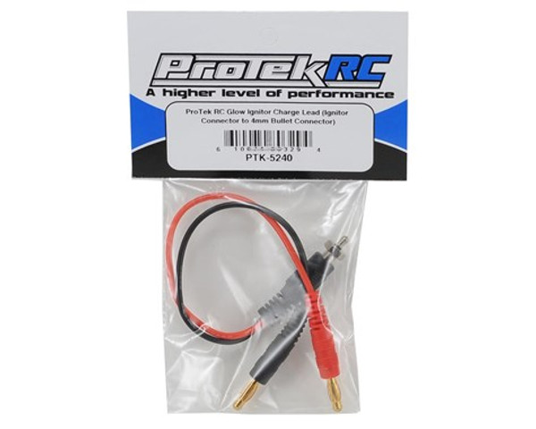 This is the ProTek R/C Glow Ignitor Charge Lead. This charge lead has a glow ignitor connector on one end that your glow ignitor will clip onto, connected to 4mm banana plugs, with high quality 18 AWG silicone wire, to connect to your battery charger. This lead is 9 inches (22.9cm) long from end to end.
