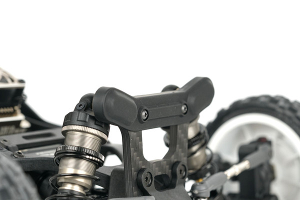 Angled lower arms lower the shock mounting position, reducing the center of gravity and improving stability. The gearbox has been optimized for ideal weight distribution, balancing size and strength. The rear hub height can be modified using the innovative Synthesis Rear Hub System and modular rear CVDs. A newly designed front and rear sway bar holder systems are included for enhanced cornering control.