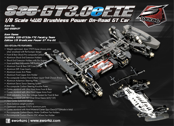 The S35-GT3.0e Factory Team Edition (FTE) is an upgrade from the S35-GT2.2e FTE which won the 2023 IFMAR E-GT world cup. It was a special project created for the SWORKz GT drivers to compete in the GT Championships. The target is to always be faster, lighter and an easier driving feel.