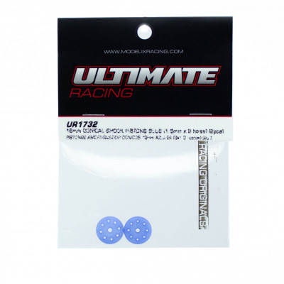 This is a set of two 16mm Tapered Shock Pistons Blue with 6x1.3mm straight holes from Ultimate Racing. These pistons are CNC machined to guarantee the concentricity between the piston and the shock bottle while ensuring its consistency between different productions. Thanks to its conical shape, depending on how we mount the piston, taper up or taper down, we can adjust the resistance that the shock absorber opposes to compression or extension. Taper up will facilitate compression and taper down will facilitate extension.